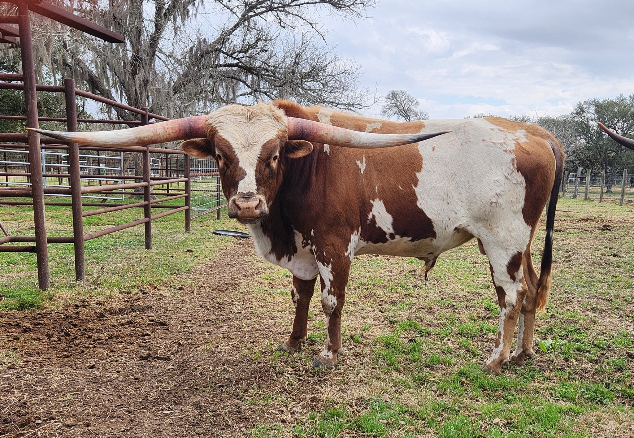 This young herd sire has "rizz" (charisma), is super clean, well-built . Dam is a big horned CR Poinsettia Jawge with a ton of total horn going back to M Arrow Wow line on top with El Coyote breeding on the bottom. Sire is the great CV Cowboy Casanova. Fertility tested and progeny on the ground.